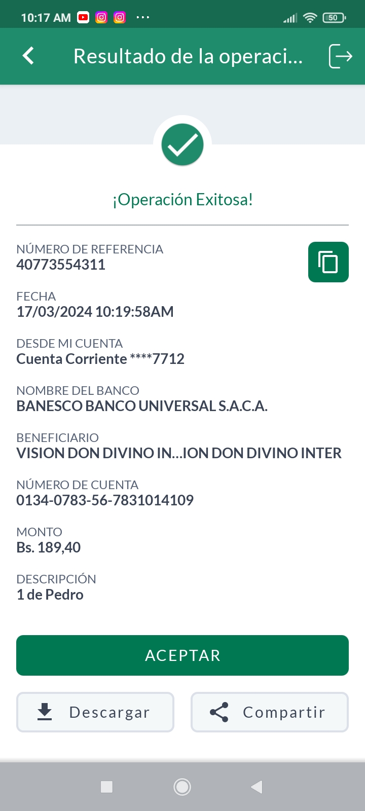 Pago realizado de Selecciona el día 2024-03-17 utilizando Transferencia Bs. Ver Comprobante